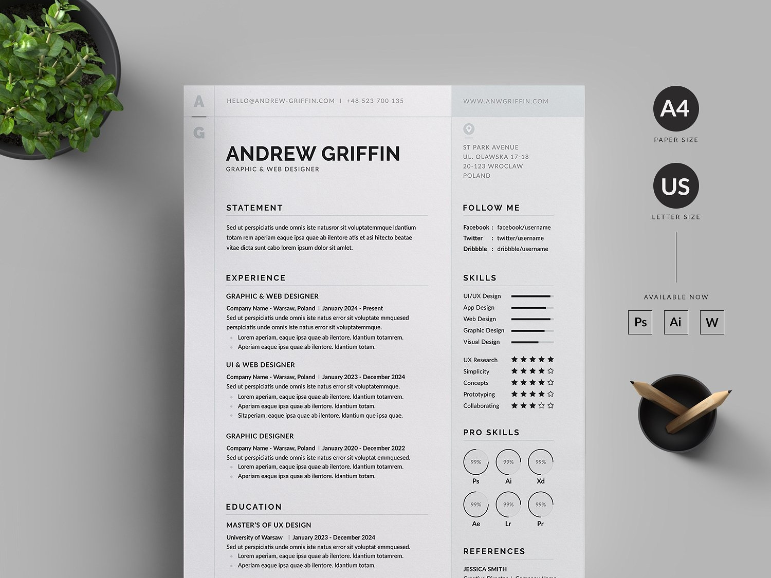 Download free graphic designer resume template psd file. This template is easy to change. They are available for instant download and entirely editable with microsoft word.